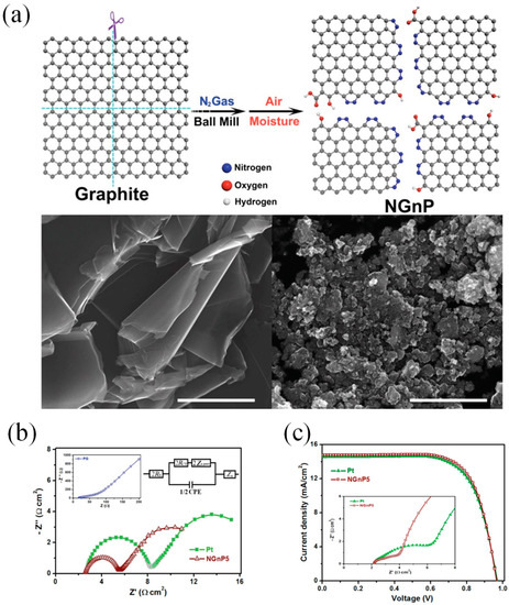 Many research groups have demonstrated that DSSCs with graphene CEs show the performances of DSSCs varied from 0.74% to 9.4% [37,38,39,40,41,42,43,44,45,46,47,48]. To the best of our knowledge, Xu and his coworkers were first to incorporate graphene materials as the catalytic CE for a DSSC [47]. The graphene sheets functionalized with 1-pyrenebutyrate (PB-G) were prepared by the reduction of graphene oxide. The conductivity of large-area flexible PB-G films exhibit seven orders of magnitude higher than that of the graphene oxide precursor. The efficiency of the DSSC with PB-G as a CE was measured to be 2.20%, compared to that of DSSC with standard Pt CE (3.98%). Graphene nanoplatelets (GnP) as a basic morphology of graphene have been prepared as the CE materials for DSSCs due to their large amount of active sites [49,50,51]. Ju et al. [14] prepared nitrogen-doped GNPs (NGnP) as metal-free electrocatalysts in DSSCs by ball-milling graphite in the presence of nitrogen gas (Figure 4a). The prepared NGnP show a structure of the nitrogen atom anchored at the edge of graphene nanoplatelets. The resultant NGnP CEs exhibited good electrocatalytic performance for the reduction of Co(bpy)33+, judging by the low charge-transfer resistance (Rct) values at the CE/electrolyte solution interface and high fill factor (71.9%) in DSSCs (Figure 4b). The performance of DSSCs with NGnP5 CE exhibited a PCE of up to 10.27%, which is higher than that of the DSSC with Pt-based CE (9.96%) (Figure 4c). Most importantly, the prepared NGnP CE exhibited superior stability compared to Pt CE by using the Co(bpy)32+/3+ redox couple. Where, the Co(bpy)32+/3+-based electrolytes not only provide higher voltage of DSSC, but also appear to be quite fast at carbon-based cathodes.