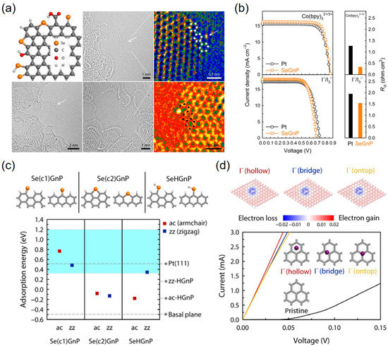 Additionally, Ju et al. [52] synthesized edge-selenated graphene nanoplatelets (SeGnPs) by a simple mechanochemical reaction between graphite and selenium (Se) powders. The SeGnPs preserved the completeness of graphene basal plane and selectively-doped selenium atom at the edge of graphene confirmed by atomic-resolution transmission electron microscopy (Figure 5a). The SeGnPs as a CE in DSSCs exhibit outstanding electrocatalytic performance and ultimately high stability in both Co(bpy)32+/3+ and conventional I−/I3− electrolyte solutions (Figure 5b). Furthermore, the theoretical calculations were applied to clarify the I3− reduction mechanism. They found that SeGnPs with single-coordinated armchair and zigzag edges demonstrated significantly enhanced electrocatalytic activity for I3− reduction (Figure 5c). The rapid electron transfer was made through the well-preserved graphitic basal plane to increase the current (Figure 5d). The efficiencies of SeGnP CE were respectively up to 10.98% and 9.17% in Co(bpy)32+/3+ and I−/I3− electrolyte solutions, compared to those of Pt CE 10.11% and 9.07% in Co(bpy)32+/3+ and I−/I3− electrolyte solutions, respectively.