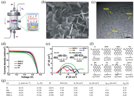Structural engineering of graphene is an efficient route to increase the specific surface area and the number of active sites/defects. For example, Yang et al. [53] synthesized nitrogen-doped holey graphene (NHG) by chemical vapor deposition with MgO template and subsequently employing N2 plasma treatment (Figure 6a). High conductivity, large surface area and abundant edge-induced defects, and nitrogen dopants of NHG were obtained (Figure 6b,c), resulting in outstanding electrocatalytic activity for the I−/I3− redox reaction. The DSSCs with NHG CEs exhibited a higher PCE of 9.07% compared with that of DSSCs with Pt CEs (8.19%) (Figure 6d), which can be ascribed to the lower sheet resistance and Rct of NHG CEs (Figure 6e,g). Moreover, the detailed mechanism was further confirmed by density functional theory (DFT) calculations, which found that the pyridinic nitrogen (PN), pyrrolic nitrogen (PR), and edge-induced defects including five-carbon ring (C5) and seven-carbon ring (C7) act as catalytically active sites to greatly enhance the catalytic activity for the triiodide reduction reaction (Figure 6f).