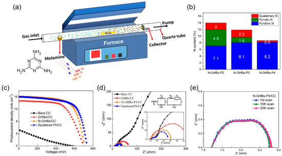 (a) A schematic representation of the chemical vapor deposition (CVD) design for N-GHBs synthesis. (b) Distributions of various N-doped configurations with different N-GHBs samples. (c) Photocurrent density-voltage curves. (d) EIS of various CEs-based DSSCs were investigated. (e) EIS stability test of the symmetrical dummy cells with two identical electrodes of N-GHBs-P3/CC [54]. Copyright 2018, Elsevier.