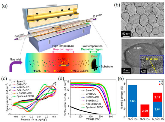 (a) A schematic illustration represents the growth of graphene hollow nanoballs (GHBs) on carbon cloth (CC) in a CVD reaction. (b) HR-TEM reveals the hollow structure and the lattice spacing of 0.34 nm of GHBs. (c) Cyclic voltammograms were tested with various CEs. (d) Photocurrent density vs. voltage curves of DSSCs with different CEs. (e) The doping amounts of the N and S atoms in N-GHBs/CC, S-GHBs/CC, and N,S-GHBs/CC are displayed for comparison [59]. Copyright 2020, Elsevier.
