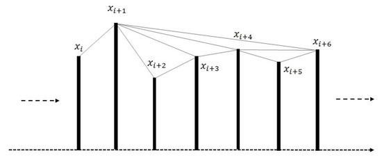 Any pairs of nodes are visible to each other via bi-directional edge if and only if the Equation (1) is satisfied. According to that we can see in the Figure 1, that the vertices or nodes and , with and , are visible to each other if and only if the Equation (1) is satisfied for all relevant j-s or all the nodes in sequence between and . This is how the visibility is checked between any pair of nodes in the entire series and accordingly bi-directional edges are drawn and Visibility Graph of a data series is constructed. It is obvious that two consecutive nodes of the series are always visible to each other and hence consecutive nodes are always connected via a bi-directional edge.