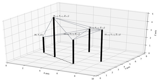 Figure 2, shows a part of 3D Visibility Graph showing 5 nodes with indexes for the purpose of illustration. According to this 3D Visibility-Graph Algorithm, in Figure 2 the vertices or nodes and , with and , have 2 vertices in between with indices . The node satisfies Equation (2) for its ) but the node does not satisfy Equation (2). Hence, the z coordinate is checked with the Equation (3), for the node and not for the next node but this node does not also obstruct visibility between the pair of nodes in question. The node does not satisfy the Equation (3) with respect to its z coordinate and hence obstruct visibility between the nodes and . Finally, we can conclude that nodes and , with and are not visible to each other.
