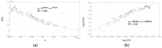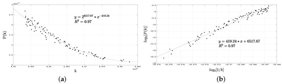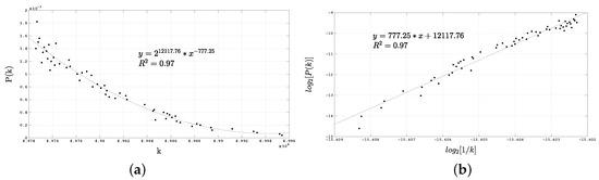 - The number of edges (k) and their corresponding degree distribution () for the 3D Visibility Graphs constructed from supersymmetric data space from 3 perspectives—, and as elaborated in Step 1 in Section 3.2, are analyzed for fitting with regard to power-law distribution. The trend of versus k can be examined from Table 1 and the Figure 6, Figure 7 and Figure 8a for all the 3 data spaces. A high range of p-values [91] and high values of and hence high degree of goodness-of-fit are obtained for the power-law fitting for k and their corresponding degree distribution for all the 3 data spaces signify the presence of high degree of inherent scale-freeness and self-similarity in the supersymmetric data spaces. This scale-freeness and self-similarity of the data space is captured from their manifestation through the -space embedded in 4-momenta of the pair of mega-jets produced from the collisions of Run B of 2010 at 7 TeV [36] of the CMS Collaboration.