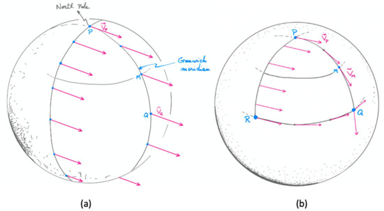 (a) Parallel transport of vector along two meridians computed in the three-dimensional Euclidean space. (b) Right: Parallel transport of vector computed with Levi-Civita’s method for the curves PRQ and PQ.