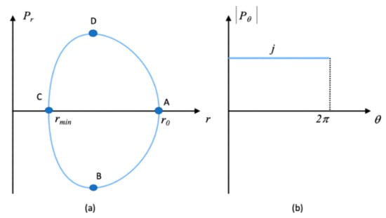 The dynamics of the FP can be visualized via the pairs of variables and , each describing a plane in which the dynamics will draw curves. The phase space provides a succinct geometrical representation of the dynamical evolution of the pendulum, illustrated in Figure 5. In the plane , is constant during the complete oscillation. Let us now go through the pendulum’s oscillation cycle in the plane , clockwise from point A. This point corresponds to FP’s release: the amplitude is at its maximum and the velocity is null. Then the bob falls down, its radial velocity decreasing ( until its absolute value reaches a maximum in B. The radial position of bob reaches a minimal value at C where the radial velocity goes back to zero. Then, the radial coordinate r of the bob increases until reaches a maximal value at D. The pendulum finally returns to point A, from where it starts a new oscillation cycle.