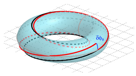 Representation of the phase space of the Foucault’s pendulum in terms of the angle-action variables [20]. The two sections of the torus (sections limited by the two grey circles) are of dimensions and . The two curves on the surface of the torus correspond to the trajectory of the pendulum neglecting the rotation of the Earth (in black) or including it (in red). A point of a curve on the torus corresponds to a given value of the couple of angle variables . The infinitesimal Berry-Hannay angle, δ, is shown in blue font.