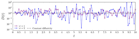 in which ( is white noise) is the Wiener process, and is an independent random variable chosen from a log-normal probability density function. A correspondence between ggBM and overall probability in Equation (4) was proven in Refs. [44,64]. The fluctuating diffusivity is shown in Figure 2 for log-normal distribution with two different standard deviation values; the dashed thin line represents the standard diffusivity (constant) associated with Brownian motion. In this context, the trajectory generated for Equation (7) possesses fluctuating diffusivity that “smudges” the white noise, allowing the rise of a grey Brownian trajectory (examples in Figure 3).