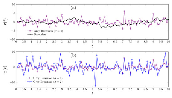 The equivalent probability distribution in Equation (4) can be computed by generalized grey Brownian motion (ggBM) [60,61,62,63], which here we refer to simply as grey Brownian motion, which obeys the following stochastic equation [44]