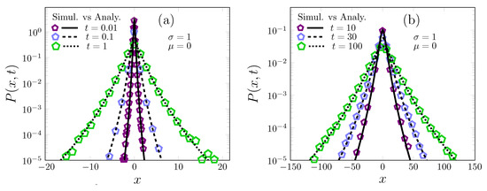 The simulated (pentagon-form symbols) and analytical (solid and dashed) curves to compare the superstatistical average (Equation (4)) with grey Brownian motion where and : (a) the PDF evolving for short periods of time; (b) the PDF evolving for long periods of time.