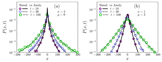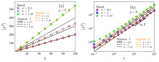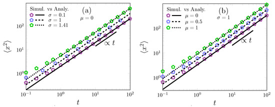 Our next step is analyzing the numerical integration of the log-normal superstatistics average of BM (i.e., Equation (4)), and the correspondence to log-normal grey Brownian motion simulations. To do this, we consider particles where each one moves according to Equation (7) for simulating the dynamical behavior of grey Brownian motion. In addition, for a short (and a long )time regime we consider steps () with variance and mean of noise equal to one (both). Figure 4 presents the analytical versus simulation results for short and long-time values. We observe that the analytical model (solid curves) agrees perfectly with the simulation data. Figure 5 confirms the previous graphical results for different standard deviation values (case a) and different mean values (case b). Finally, Figure 6 shows the linear time relation of the MSD for two situations, setting one of the parameters and ranging another. All these graphical results confirm the simulation and analytical agreement. Thereby, the results suggest that the log-normal superstatistics approach of a mixture of Gaussian process implies heavy-tailed distributions, which maintain one of the Brownian features, the linear time relation for MSD.