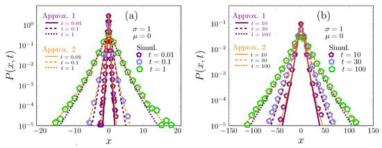 Different probability distributions for simulation data (pentagon-form symbols), the inverse Fourier transform of the first approximation (11) in violet (solid and dashed) curves and the second approximation in Equation (14) in orange (solid and dashed) curves: (a) the PDF evolves for short times; (b) the PDF evolves for long times.