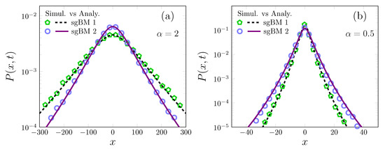 The PDFs associated with two models of scaled grey Brownian motion (sgBM) for , with fluctuating diffusivity following the log-normal distribution (3). Specifically, the PDF profiles for analytical 1 (23) and analytical 2 (24) compared with simulation sgBM 1 (18) and simulation sgBM 2 (19), respectively, are shown. The comparisons are shown for (a) and (b) .