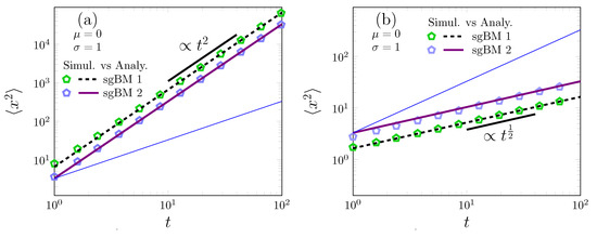 A particular family of scaled BM that considers () and , has been applied in experimental and theoretical systems [78,79,80]. This time-scaled choice implies a second moment that is not linear with time, i.e., , that is especially useful in the anomalous diffusion framework. Therefore, here we consider a family of power-law time scales for both sgBMs (18) and (19) described by