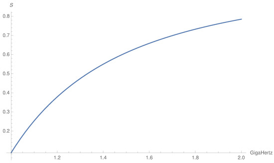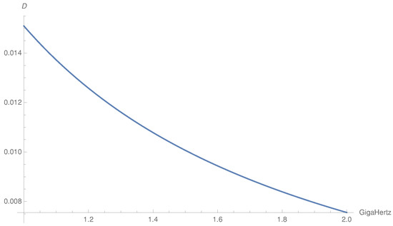 The behavior of as a function of z for fixed x is different as there is a maximum for cm. Further, is symmetric in z, the dependence on is not critical, and the shape of the curve remains the same for all values in GHz. An example of the same is shown in Figure 5.