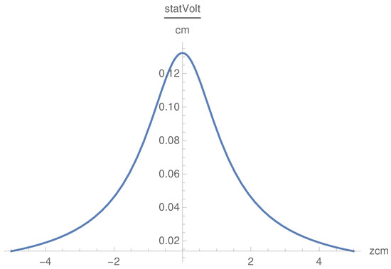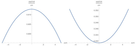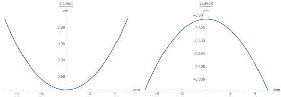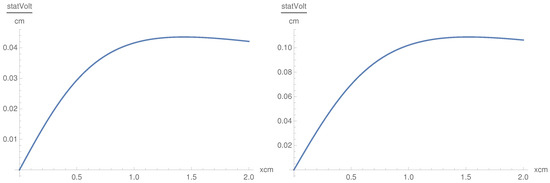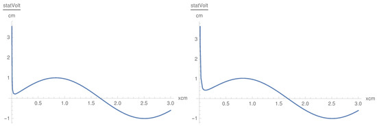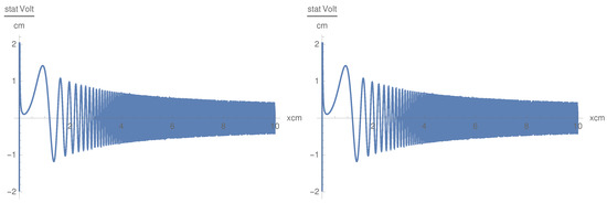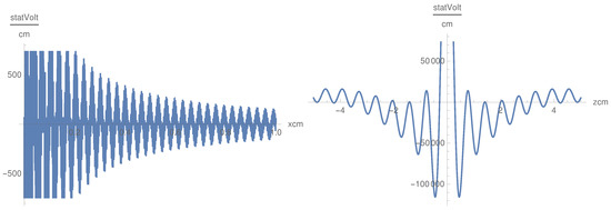 In this case, we get oscillating behavior in the x direction. The dependence on x is oscillatory with oscillations symmetric in z (Figure 6). is a convex symmetric function of z as the convexity being modulated by the term (Figure 7). , as a function of x, is defined in the interval cm, which is different from the behavior of . Nevertheless, this result shows that the component, as well as the component, penetrate the plasma with oscillations, which corresponds to the physical situation. The singularity in x at the origin is smoothed by inserting a small positive value in the denominator in the cases of and .