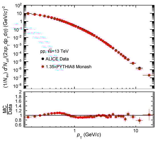 Upper panel: comparison of charged particle spectra in pp collisions at = 13 TeV between ALICE data [20] and Monte Carlo (MC) simulation, which are used for this analysis. Lower panel: the ratio between scaled simulated data and experimental data.