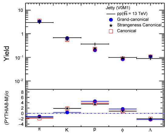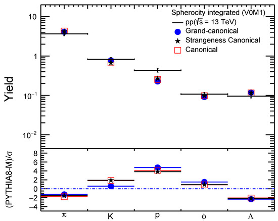 The particle yields in pp collisions are fitted using THERMUS [21] for the grand canonical, strangeness canonical, and canonical ensembles with three free parameters, namely , , and R. In the case of SCE, we have an additional free parameter, known as the strangeness canonical radius, which is taken as the fireball radius (i.e., ) [21]. The comparison between the model and data for the spherocity integrated class for the highest multiplicity class is shown in Figure 3. In the top panel, the black bar shows the simulated data points obtained using PYTHIA8. The blue solid circles are obtained for the grand canonical ensemble. The black solid stars are for the strangeness canonical ensemble. The red rectangular boxes are for the canonical ensemble. The bottom panel shows the deviation from the fit, which is defined as