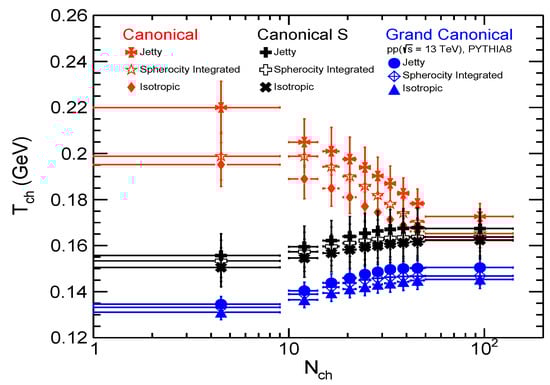 The chemical freeze-out temperature as a function of charged particle multiplicity () for the canonical, strangeness canonical, and grand canonical ensembles. The red and black points are obtained using the canonical ensemble and the strangeness canonical ensemble, respectively, whereas the blue points are for the grand canonical ensemble.