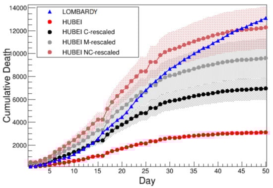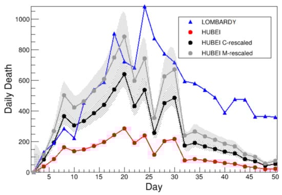 where death toll in China are  and . The uncertainties on the mortality factor  are evaluated using the Gaussian approximation from [], and the uncertainty on the scale factor is determined through error propagation. Figure 1 shows the comparison of the cumulative number of deaths among Lombardy (blue), actual Hubei (red) and Hubei rescaled (black) according to Equation (2), while Figure 2 shows the comparison of the two-day number of deaths among the same regions.
