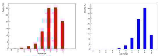 The mean population age in China is 37 years old as reported in 2019 [], while in Italy is 45 years old as reported in 2018 []. Consequently, during the first months of the pandemic, the mean victim age (MVA) in Italy is around 80 years old [], while for China, from data sorted according to population age [], the MVA is estimated to be 70 years. Similar age differences were found checking the infected people mean age, about 50 in China [] and 62 for Italy []. Table 2 shows the comparison of mean ages in the early months of the pandemic, between the two countries. Figure 3 shows the distribution of the number of victims per age category [,]. The mean victims age is the quantity to be elaborated further on, in the following.