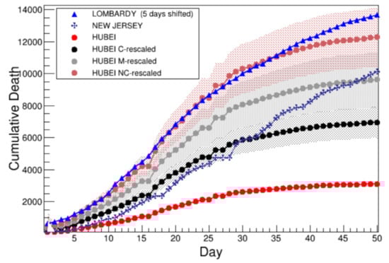 Since the starting day for each population is a conventional choice, it is possible to shift in time one distribution with respect to the others: in this way, the first day is synchronized among different samples. The adopted time offset is the first day in which both Lombardy and NC-rescaled Hubei exceed the number of 1500 deaths, instead of the 100 deaths previously used. This approach is equivalent to move the Lombardy distribution 5 days back in time, namely starting from 11 March. As a result of this choice, the agreement between Lombardy and NC-rescaled Hubei is very good, especially in the rising part of the curve, as shown in Figure 4.