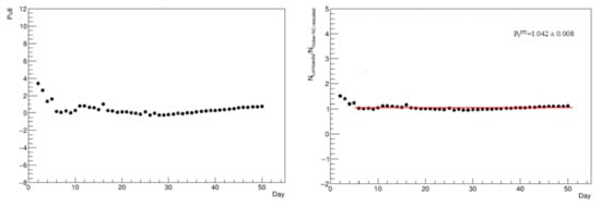 The comparison between Lombardy and NC-rescaled Hubei is studied in detail by evaluating the pull in Figure 5 (left panel), namely the difference divided by the uncertainty, dominated by the systematic one associated with the scale factor, and the ratio of the two distribution entries in Figure 5 (right panel). In this latter case, a constant term is fit to the ratio, to estimate the fractional difference between the two distributions, at least starting from a time period where the agreement tends to be good: from a common time defined as the 5th day, the two distributions have an average overall difference of .