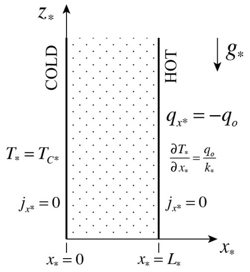A binary fluid mixture is a general form of a mixture consisting typically of two-phases with one phase being fluid and the other phase being either another fluid (miscible, e.g., water and alcohol, or immiscible like emulsions, e.g., oil in water), or solid particles either dissolved in the fluid (solution, e.g., salt in water, in this case, this will be one single-phase), or suspended in the fluid (colloids, e.g., aluminum powder in water, aerosols in the air). Natural convection in a binary fluid mixture placed between two vertical walls and differentially heated from the sides is being considered. The extreme difficulty or even impossibility in setting specified values for the mass fraction (solute concentration) on the boundaries led to applying zero mass flux boundary conditions on these walls combined with the thermodiffusion flux. The thermal boundary conditions are of a constant heating heat flux on one wall and a constant cold (ambient) temperature on the other wall. Note that it is also extremely difficult to apply in practice a cooling heat flux boundary condition, while a heating heat flux can easily be applied by taping a film of electrically conducting material and passing an electric current through it. The Ohm’s heating in the film will produce the required heat flux into the fluid. Both the Soret (Bird et al. [