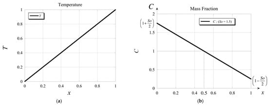 The governing Equations (7)–(11) and boundary conditions (12), (13) are being converted into a dimensionless form by using as scales for density, length, velocity, time, pressure, temperature difference, and mass fraction, the reference value of density