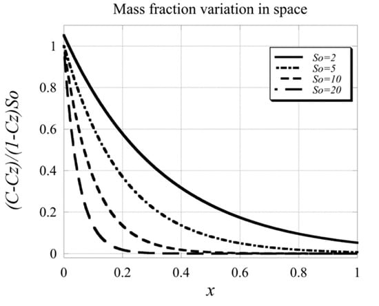Note that should we have used imposed mass fraction values on the boundaries, this anomaly would have been prevented, and the mass fraction values would fall in between the values imposed on the boundaries. For example, if the boundary conditions for the mass fraction would have been: for and for with , then the solution to Equation (41) subject to these boundary conditions would have been and everywhere within the domain. Actually . However, as indicated in the introduction, imposing set values of the mass fraction on the boundaries is not practical, and it is most likely even impossible.