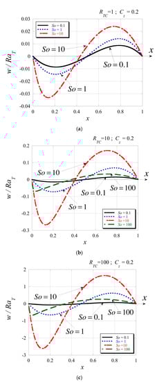 Figure 6, one can also observe that the location of the non-boundary zero of the velocity varies with changing the value of the Soret number. To clarify this point further, we present the velocity profiles in