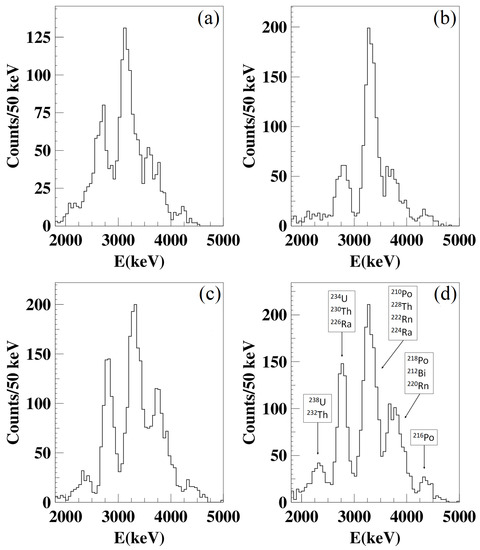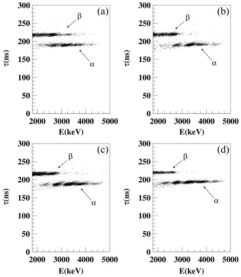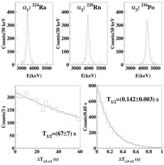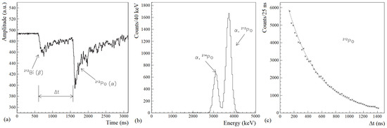 The activities of Th (Th family), Ac (U) and Ra (U) can be determined with the help of the time–amplitude method. In particular, the energy and arrival time of the acquired events can be used to select fast decay chains from the Th, U and U families. The method of time–amplitude analysis is widely described (see, e.g., [29,61,62,71]).