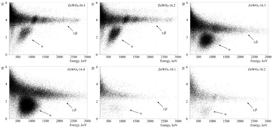 Scatter plots of the SI versus energy for some ZnWO crystal scintillators developed by the R&D campaign within the ADAMO project [55] are shown in Figure 2.