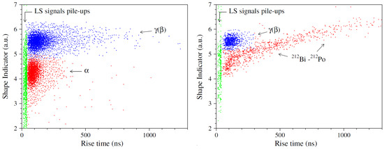 Another clear example is given in the framework of the AURORA experiment [63], performed to investigate the double beta decay of Cd with radio-pure CdWO crystals (enriched at 82% in Cd). The front-edge analysis was developed to reject the fast subchain of Bi-Po decays. A rise time for each signal was calculated as time between the signal origin and the time where signal reach 0.7 of its maximal value. The distributions of SI versus rise time for the background events acquired with the CdWO detector No. 2 over 26,831 h are shown in Figure 6. Two energy intervals are considered: (0.6–1.3) MeV and (1.7–4.0) MeV (Figure 6 left and right, respectively). The latter interval includes the expected sum energy released in the Bi-Po decay: around (1.8–4.4) MeV; these events are characterized by a longer rise time. The green events in Figure 6 (labeled as “LS signals pile-ups”) were identified and rejected as pile-ups of the CdWO pulses with the signals coming from the liquid scintillator surrounding the CdWO crystals [63]. The front-edge analysis allowed the rejection of these events thanks to a shorter rise time (less than 38 ns) of the liquid scintillator pulses.