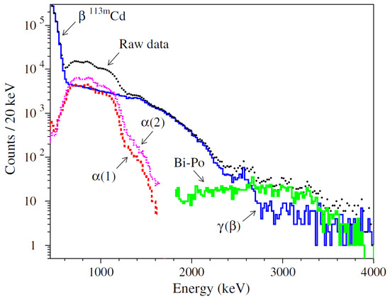 The Bi-Po events, selected by the front-edge analysis, are part of the Th subchain. Its activity was determined to be 0.018(2) mBq/kg and 0.027(3) mBq/kg for the crystals No. 1 and No. 2, respectively, in good agreement with the result of the time–amplitude analysis. As shown in Figure 7 the Bi-Po events contribute to the 2.7–2.9 MeV energy region, where the signal of the decay of Cd is expected, so that their removal allowed the reduction of the background counting rate by a factor of about 1.5 for this decay mode.
