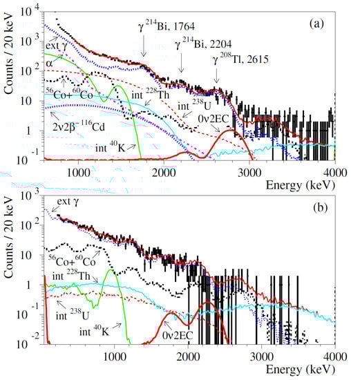 As an example of background model, here, the case of analysis of data accumulated in a low-background experiment to search for 2 decay of Cd is considered. The setup consists of an enriched CdWO detector (enriched in Cd at 66%) placed between two CdWO scintillation counters (with natural Cd composition) in a close geometry [64]. Several background components were simulated, including internal (in the CdWO crystal scintillator) and external sources. In particular, the activities of internal Ra → Pb, Pb →Pb, Ra →Th, Th →Pb and K were taken from those measured in the previous stages of the experiment [79,80]. Moreover, the contribution of internal particles from Th and U decay chains not discarded by the pulse shape analysis and of internal decay of Cd with = 2.63 × 10 year [63] were taken into account. Regarding the external background sources, Ra →Pb, Ra →Th, Th → Pb and K were simulated in the internal and external copper details, in the PbWO crystal light-guide, in the quartz light guides and in the PMTs. Moreover, the contribution of Co and Co in the internal copper bricks, Ra →Pb and Th → Pb in the CdWO crystal scintillators and Pb → Pb in the PbWO crystal light-guide were taken into account. Few peaks due to high intensity rays from external contaminants are well visible in the measured energy spectrum reported in Figure 10a: the peaks at 1764 keV and 2204 keV due to external Bi and the peak at 2615 keV produced by external Tl. Recently, in the new stage of the experiment, the background induced by external contaminants has been reduced by a factor ≈2 in the energy interval 1200–3500 keV, thanks to the use of ultraradiopure PMTs, longer quartz light-guides for the CdWO counters and a more powerful passive shield of the detector system. The simulations were performed with the EGSnrc package and the DECAY0 event generator [81] (update 5 December 2018) while the residual spectrum of particles was derived from the experimental data using the pulse shape analysis. The obtained background models were used to fit the measured spectra for and events in configurations that were of interest for the study of the Cd double beta decay modes. In particular, the anticoincidence spectrum with the CdWO counters was fitted in the energy intervals (940–4000) keV, whereas the spectrum obtained in coincidence with event(s) in at least one of the CdWO counters in the energy window (511 ± 2) keV was fitted in the energy interval (240–3940) keV. The fit quality is reasonable ( = 457 for 235 degrees of freedom). Figure 10 shows the results of the fit and the main components of the background.