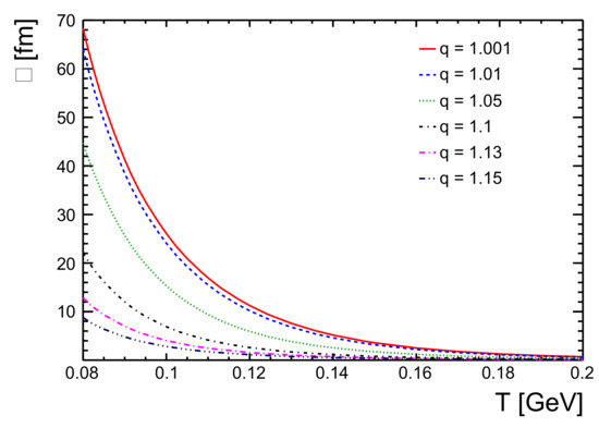 To calculate the mean free path, we used Equation (10). In Figure 1, we plot the mean free path, , of a hadron gas system as a function of temperature for different values of q-parameter. One observes that, for low temperature, the mean free path of the system is very high and suddenly decreases, becoming minimum at the high temperature region, which usually corresponds to freeze-out temperatures in high energy hadronic and nuclear collisions [39]. One also notices that the mean free path is highly sensitive to the q parameter in the low temperature regime, whereas the dependency decreases at higher temperatures becoming almost negligible. These trends are expected because, at low temperature, the number density in the system is less, which results in a high . As the temperature increases, the number density also increases drastically between a short temperature range before becoming almost constant at very high temperatures. In the low temperature regime, at a given temperature, the mean free path decreases when the system slowly moves away from equilibrium. For an expanding fireball, initially, the system volume is low and, hence, for a given number of particles, the mean free path is smaller. The constituents of the system go through mutual collisions as a part of the process of equilibration, while the system is still expanding, resulting in a higher mean free path. Below the expected kinetic freeze-out temperature, the fireball volume becomes much higher and the mean free path becomes higher than the system volume.