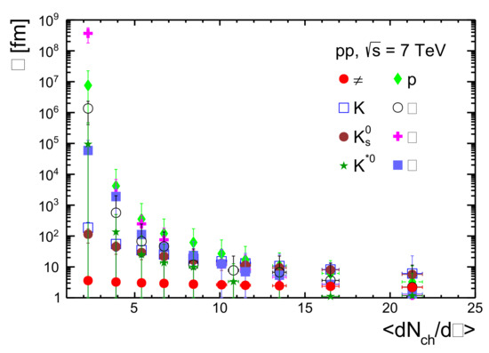 - Chatrchyan, S.; Khachatryan, V.; Sirunyan, A.M.; Tumasyan, A.; Adam, W.; Aguilo, E.; Bergauer, T.; Dragicevic, M.; Erö, J.; Fabjan, C.; et al. Study of the inclusive production of charged pions, kaons, and protons in pp collisions at =0.9, 2.76, and 7 TeV. Eur. Phys. J. C 2012, 72, 2164. [Google Scholar] [CrossRef]