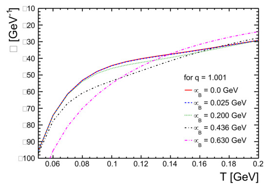 Figure 2 shows the mean free path of a hadron gas as a function of temperature for different values of baryochemical potentials. For this study, we took five different baryochemical potentials; = 0, 0.025, 0.200, 0.436, and 0.600 GeV, which correspond to, respectively, LHC energies, RHIC at = 200 GeV and 19.6 GeV, RHIC/FAIR at = 7.7 GeV, and NICA at = 3 GeV [40,41,42,43]. Here, we took the non-extensive parameter, q = 1.001, which corresponds to a near equilibrium state. One observes that, when is zero, the trend of the mean free path of the system mimics the trend which we get from Figure 1. However, as we go on increasing the value of , which happens when one moves down in collision energy, the mean free path of the system at a given temperature becomes lower. The dependence on baryochemical potential on the mean free path is clearly visible in the low temperature regime. There is universality in the decreasing nature of the mean free path as a function of temperature for various values. This is due to the fact that, with an increase in baryon chemical potential, the number density of the system will increase, resulting in a lower mean free path. Similarly, one expects to produce more particles at higher system temperatures, making the number density in the system higher. This makes the mean free path decrease with temperature irrespective of the baryochemical potential of the system. This is clearly evident from Figure 2.