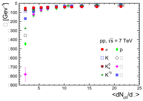 Figure 6 shows the isobaric expansivity of the hadron gas system formed in LHC pp collisions at = 7 TeV as a function of final state-charged particle multiplicity, which is an event classifier in pp collisions. We took the temperature and q values from the Tsallis fit to the -spectra of the identified particles produced in LHC pp collisions at = 7 TeV [47] to estimate the isobaric expansivity of the system for different identified particles [44]. At the LHC energies, the baryochemical potential of the system is almost zero, and for our studies, we use = 0. One observes an increasing trend in the expansivity of the system as the final state charged particle multiplicity increases. For lower , the expansivity of identified particles are different and mostly follow a mass ordering, with massive particle having lower than lighter particles. This is a consequence of the fact that, in the hadronic phase, the number density of the lighter particles are higher than that of the massive particles—statistical production of particles in the multi-particle production process. When we increase the temperature, the number density of all the particles increases. The given temperature can be translated into the kinetic energy of the particles in the system. Taking the solid state and gaseous phase analogy, for a denser system, the increase in temperature makes a small increase in the volume of the system, whereas for a less dense system, the change is very high. However, after a certain charged particle multiplicity = 10, we observe that all the hadronic species in the system have almost the same isobaric expansivity. This suggests a change in the dynamics of the system at higher than 10 [48].