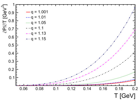 We use Equation (14) to estimate , the thermal pressure of the produced system. Figure 7 shows the variation in as a function of temperature for different values of the non-extensive parameter q. One observes that for low temperatures, the thermal pressure is lower for the system, but as the temperature increases, the thermal pressure also increases. One also can see that, when the system is near equilibrium, gets the lowest value. For higher q values, increases, meaning that, as the degree of non-extensivity of the system increases, the thermal pressure also increases at any given temperature. Hence, the thermal pressure is responsible for the degree of non-equilibration of the system. In addition, at lower temperatures, the number density of the system would be smaller (as the volume of the system increases). With a small change in temperature, the change in pressure of the system would be smaller in comparison to the case of higher temperature regimes, where the number density of the system would be much higher, which contributes to a higher thermal pressure.