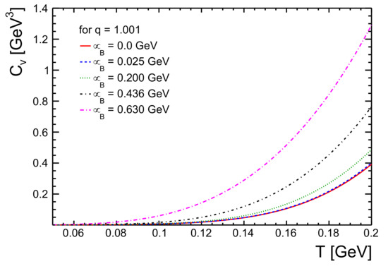 We calculate the specific heat at constant volume for a system with hadrons as the constituents using Equation (16). Figure 8 shows the variation in as a function of temperature. One sees that, for low temperatures, the specific heat of the system is low while it increases gradually as the temperature increases. One also observes that, for q = 1.001, i.e., when the system is near equilibrium, the specific heat of the system gets the lowest value. This is expected, as for an equilibrated system, the degree of change in the internal energy of the system is less. For higher q values, becomes higher at any given temperature. From Figure 9, one observes that the baryochemical potential plays a big role in the outcome of . For all values, the of the system shows an increase. The higher the values, the higher the values of specific heat at all temperatures.