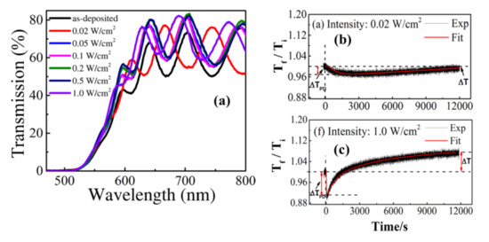 (a) Transmission spectra of Ge16.8Se83.2 thin film in as-prepared and illuminated states at various power densities of 0.02, 0.05, 0.1, 0.2, 0.5, and 1 W/cm2, respectively. Time evolution of f/i when excited with low (b) 0.02 and high (c) 1 W/cm2 power density of the laser. All Figures are reprinted with permission from [33] Copyright 2017, Springer Nature.