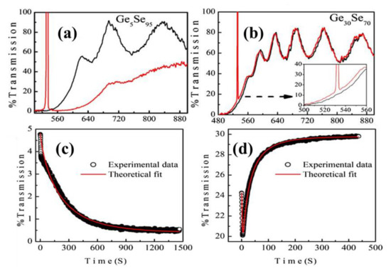 In line with more detailed work, Kumar et al. showed that by varying the relative composition of Ge and Se, they obtain a crossover from PD to PB in GexSe100-x thin films [34]. In this regard, Figure 6a,b shows the transmission spectra of Ge-deficient Ge5Se95 and Ge-rich Ge30Se70 thin films in as-prepared (black) and illuminated (red) states when illuminated with 532 nm CW laser. The strong, red-shifted absorption edge depicts PD in the former, while a weak blue shift in the latter demonstrates PB. Singe wavelength kinetics at 560 nm for Ge5Se95 and Ge30Se70 are shown in Figure 6c and Figure 6d, respectively. For Ge5Se95, the final transmission saturates much below the initial value in line with strong PD, whereas for Ge30Se70, the sample ends up in an overall PB state at the final stage of illumination.
