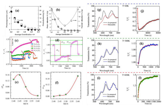 Ternary Ge-As-Se forms a special family of ChGs which shows the unusual coexistence of fast PD and slow PB under CW illumination [18]. Ge-As-Se is a prototype of ChGs and has advantages because of the similar size and electronegativity of the individual components that form a close-to-ideal network [35]. In ChGs, structural connectivity is usually quantified by the mean coordination number (MCN), which is denoted by ⟨⟩ and defined by the sum of the respective elemental concentrations times their covalent coordination number [36]. It was proposed by Phillips and Thorpe’s rigidity theory [37,38] that the physicochemical properties of ChGs depend strongly on the chemical composition [19,20] and likewise vary with ⟨⟩. From network rigidity theory, Philips [37] predicted that percolation transition at ⟨⟩ = 2.40 takes place from an under-constrained “floppy” network to an over-constrained “rigid” one. In particular, many previous studies by Lucas and Calvez with CW illumination have shown that properties like PD, photo relaxation, and photo expansion exhibit an extremum at ⟨⟩ = 2.4 with a monotonic decreasing trend, as shown in Figure 7a,b [6,35,39]. Notably, all samples for PD measurements were 1 mm thick polished discs. In stark contrast, our previous work established that chemical composition plays a major role and dominates over MCN in determining the light-induced effects [40]. In this regard, Figure 7c shows the single wavelength kinetics of a-GexAs35-xSe65 (x = 5, 10, 15 and 25) thin films of thickness 1 μm. Following the illumination with the pump beam, f/i (f and f represents final and initial transmission, respectively) decreases instantaneously for all samples to depict PD and eventually saturates within a few tens of seconds. After PD saturates completely, f/i gradually starts increasing in line with PB for all samples except x = 5. For the samples with x > 15, the final transmission saturates well above the as-prepared value whereas for the samples with x < 15, final transmission saturates below the initial transmission. After the transmission saturates to a PD/PB state, transient effect takes place after switching off the laser. To quantify the observed PD and PB, they are calculated the way as shown in Figure 7d. Figure 7e shows that unlike network rigidity theory, PD does not follow regular trend with MCN, i.e., disappears at MCN = 2.4, rather gradually decreases with increase in MCN. On the contrary, in Figure 7f we found that PB increases linearly with MCN till 2.5 with a sudden jump at 2.6. Such observations clearly indicate that PD and PB do not follow usual trend with MCN as predicted by network rigidity theory. In fact, chemical composition, i.e., Ge:As composition ratio plays the dominant role.