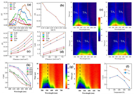 Till now, in all the above-mentioned experiments, the transient photoinduced effects are probed at fixed wavelengths, and therefore information of such effects over a broadband absorption spectrum remains unknown for ns laser excitation. Likewise, although the effects of measuring temperature and excitation fluence are well established for CW illumination [18,40], their effects remain unexplored for ns laser. In our previous work in a-GexAs35-xSe65 thin films of average thickness of 1 μm, we attempted to address such issues by performing TA measurements with 5 ns, 532 nm laser [16]. In this regard, Figure 9a depicts the absorbance change (), i.e., TA for six samples with varying MCN from 2.35 to 2.6 at fixed probe delay of 200 ns. Here, we defined = −log(es/gs), where es is time dependent transmitted intensity of probe pulse in the excited state after pump excitation and gs is the transmitted intensity of probe pulses in the ground state, respectively. It can be seen that TA spectra are compositionally tunable as it blueshifts with increase in x and MCN.