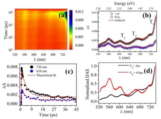 (a) 2D contour plot of TA spectra of GeSe2 thin film for probe delays in ps time domain. (b) TA spectra at different probe delays at ps time. (c) Temporal evolution of TA at 730 and 610 nm along with theoretical fit (red line). (d) Normalized decay associated spectra (DAS) in ps time delays. All Figures are reprinted with permission from [15] Copyright 2014, Springer Nature.