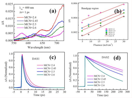 We have seen earlier that ns TA in GexAs35-xSe65 thin films decreases from floppy to rigid networks in accordance with network rigidity theory [37,38]. To prove the validity of the theory under ultrafast pulsed excitation, we performed femtosecond pump-probe measurements in GexAs35-xSe65 thin films of thickness 700 nm with 400 nm, 120 fs laser, and the TA data for the samples are shown in Figure 11a at probe delay of 1 ps [63]. TA decreases when MCN increases from 2.4 to 2.6; however, interestingly, even beyond the rigidity percolation threshold, the sample with MCN = 2.6 shows significant TA, which was not predicted by network rigidity theory. In fact, with the increase in excitation fluence, we could observe a manifold increase in the amplitude of TA for MCN = 2.6 as well as for other samples in a linear fashion, as shown in Figure 11b. Since Figure 11a demonstrates that TA decay rates are different in different regions of the spectra, it calls for global DAS analysis over a broadband wavelength regime. In this regard, Figure 11c,d show the kinetics of DAS1 and DAS2 (640 nm), from the sub-bandgap (690–720 nm) and bandgap (600–640 nm) region, respectively. DAS1 in the sub-bandgap region for all samples within 10s of picosecond (ps), which is associated with electron-lattice interaction. From Figure 11c, we found that the DAS1 curve is indistinguishable for MCN 2.5 and 2.6 but least steep for MCN 2.4, which tells us that electron-lattice interaction becomes slower in a lightly constrained network compared to over-constrained ones. In stark contrast, DAS2 is slower than DAS1 and occurs over a few hundred ps; it becomes steeper while transitioning from ⟨⟩ = 2.40 to 2.60. Such an observation indicates that exciton recombination and associated structural changes become faster in over-constrained networks compared to lightly constrained ones thanks to the strong restoring forces of the rigid network. Numerically, τ2 corresponding to DAS2 is found to be 417 ± 3, 355 ± 3, 271 ± 3, and 151 ± 2 ps for MCN 2.4, 2.45, 2.5, and 2.6, respectively.