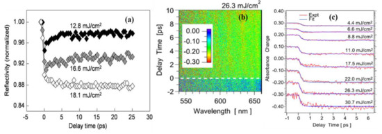 (a) Change in reflectivity of the probe pulse at different probe delays for fluence of 12.8, 16.6, and 18.1 mJ/cm2, respectively. All Figures are reprinted with permission from [64] Copyright 2014, American Institute of Physics. (b) 2D image of the TA in crystalline Ge-Sb-Te (GST) film for the laser fluence of 26.3 mJ/ cm2. (c) Temporal evolution of the absorbance in crystalline GST film in ps time domain for different laser fluences. All Figures are reprinted with permission from [65] Copyright 2014, American Institute of Physics.