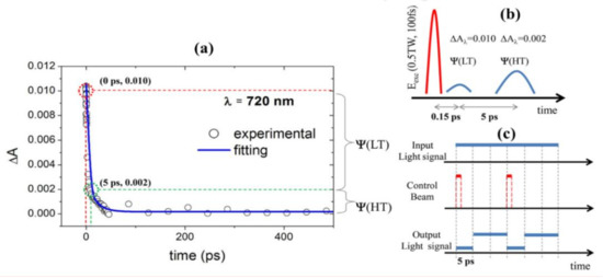 Ultrafast light-induced effects have, in a-Se/Ag bilayer ChGs of thickness 500 nm (Se 450 nm and Ag 50 nm), found tremendous potential application thanks to the formation of spatially ordered and interconnected Ag nanoparticles (AgNPs) on the surface of Se through optically driven diffusion [67]. The AgNP, after the formation, interacts with intense femtosecond laser pulses and provides an ultrafast optical response that can be exploited for application. In this regard, Figure 13a shows the time evolution of kinetics curves of AgNP on Se at 720 nm. The TA decays to 20% of the maximum within a time period of 5 ps. By defining maximum absorbance as high transmission (HT) and 20% absorbance as low transmission (LT), the response can be utilized to make an optical switching device between HT to LT with a switching speed of 5 ps (Figure 13b). As an example, a schematic of an optical modulator is shown in Figure 13c in which the control pump beam modulates the transmission of the signal probe beam. The ultrafast exciton-plasmon coupling has also been exploited to explore new functionalities in plasmon/ChGs heterostructures which are unachievable by individual components [68].